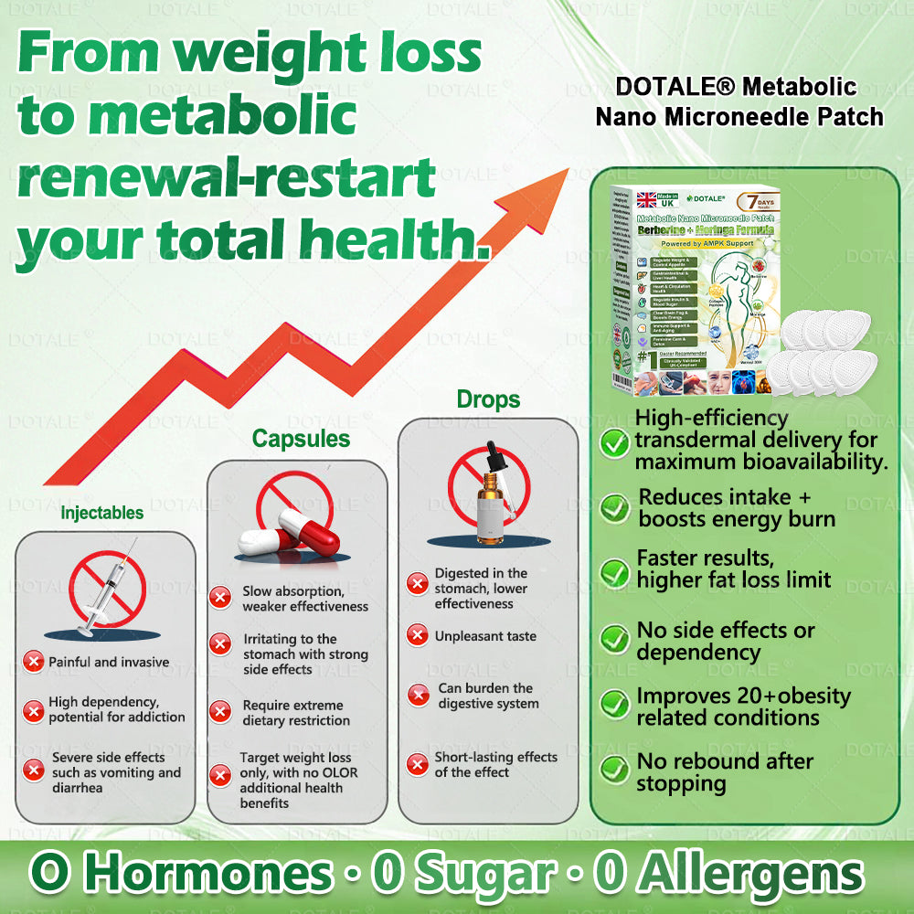 ✅ 𝑫𝑶𝑻𝑨𝑳𝑬® 𝑴𝒆𝒕𝒂𝒃𝒐𝒍𝒊𝒄 𝑵𝒂𝒏𝒐 𝑴𝒊𝒄𝒓𝒐𝒏𝒆𝒆𝒅𝒍𝒆 𝑷𝒂𝒕𝒄𝒉 breaking away from the burden of traditional injectable or oral weight-loss products, this advanced nano microneedle transdermal delivery system gently and steadily releases active ingredients for up to 8 hours. Core ingredients Moringa and Berberine work synergistically to support appetite management and lipid metabolism, making fat loss feel more natural and effortless—without extreme dieting or physical strain. At the same time, NAD⁺ supports cellular energy levels and skin firmness, helping maintain a healthy, well-toned appearance during body-weight changes. The overall formula is gentle and stable, offering a more comfortable experience for those seeking an effective, non-irritating, and non-injectable approach to weight management.
