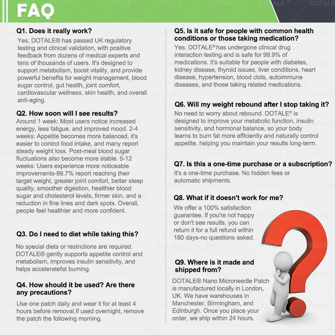 “We are a UK-based endocrinology research team, and many members of our team have personally faced obesity and its associated health complications.”Over the years, we have also evaluated commonly available weight-loss interventions on the market, including injectable therapies, capsules, and Oral weight-loss pills. However, their outcomes were often limited, and many were accompanied by tolerability concerns. These experiences motivated us to develop a safer, more natural, and more effective approach to metabolic health and weight management. After more than 12 years of research, our team initiated self-testing of this program, successfully overcoming the limitations of traditional single-pathway interventions that frequently cause gastrointestinal side effects. By adopting a dual-pathway strategy—supporting appetite regulation and fat metabolism while also addressing post-weight-loss skin firmness—we observed significant improvements in body weight and metabolic health, without rebound weight gain or adverse reactions. Subsequently, we conducted large-scale studies and clinical trials involving more than 5,000 participants, further validating the performance of 𝑫𝑶𝑻𝑨𝑳𝑬® 𝑴𝒆𝒕𝒂𝒃𝒐𝒍𝒊𝒄 𝑵𝒂𝒏𝒐 𝑴𝒊𝒄𝒓𝒐𝒏𝒆𝒆𝒅𝒍𝒆 𝑷𝒂𝒕𝒄𝒉 in metabolic regulation, appetite control, and overall health outcomes. These benefits were particularly pronounced among overweight or obese adults over the age of 40. Supported by contemporary medical research, 𝑫𝑶𝑻𝑨𝑳𝑬® 𝑴𝒆𝒕𝒂𝒃𝒐𝒍𝒊𝒄 𝑵𝒂𝒏𝒐 𝑴𝒊𝒄𝒓𝒐𝒏𝒆𝒆𝒅𝒍𝒆 𝑷𝒂𝒕𝒄𝒉 has undergone rigorous Canadian regulatory review and evaluation, with its safety, effectiveness, and compliance formally recognized. This formulation represents a scientific advancement beyond conventional weight-loss products that are often associated with significant gastrointestinal burden, offering a natural, safe, and effective option for individuals seeking comprehensive metabolic support and sustainable long-term weight management.”
